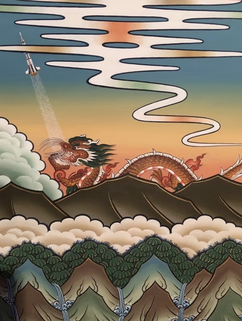 Some of his artworks feature rockets launching from lotus flowers, Starbucks cups, and even hatching dragons over the ocean—a whimsical fusion of spirituality and space-age imagination. While continuing traditional thangkas, Namgay’s rocket series has become a favourite among visitors to Bhutan.